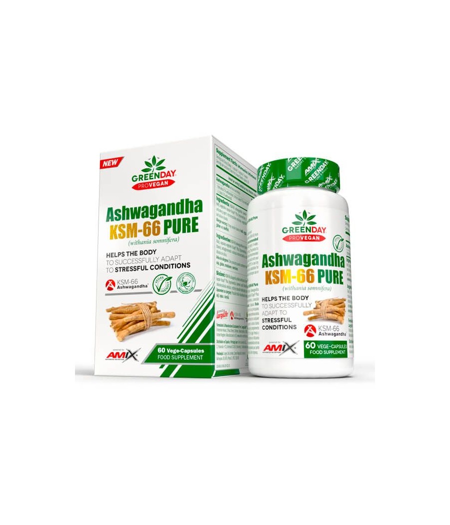 GreenDay® ProVegan Ashwagandha KSM-66 Pure es un complemento alimenticio en cápsulas vegetales a base del extracto patentado (KSM-66) de la raíz Withania somnifera L., conocida como Ashwagandha. Este suplemento está diseñado para ayudar a mantener la relajación y el bienestar físico y mental.